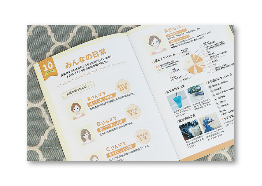 日々、医療ケアを行なっている保護者様の経験を元に作り上げた一冊です。お子様と一緒に見ていただけるようにやさしい色味を使い、可愛らしさと内容の分かりやすさを意識してデザインしました。