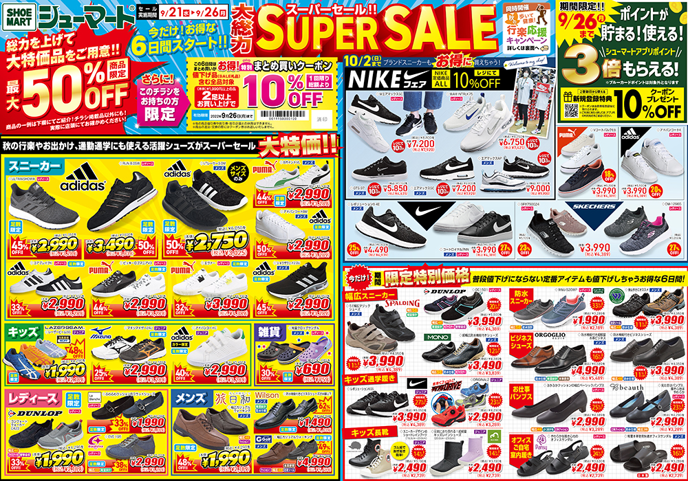 株式会社シューマート様|秋の行楽応援キャンペーン 2022年9月28日 最終更新日時 : 2022年9月28日 remadesign 株式会社シューマート様 『大総力SUPER SALE/歩いて健康!秋の行楽応援キャンペーン』 お得なキャンペーン企画&クーポン券がついて楽しみが詰まったセールチラシ。 DATA Criant: 株式会社シューマート Area: 長野県 Category: チラシ https://www.shoemart.co.jp